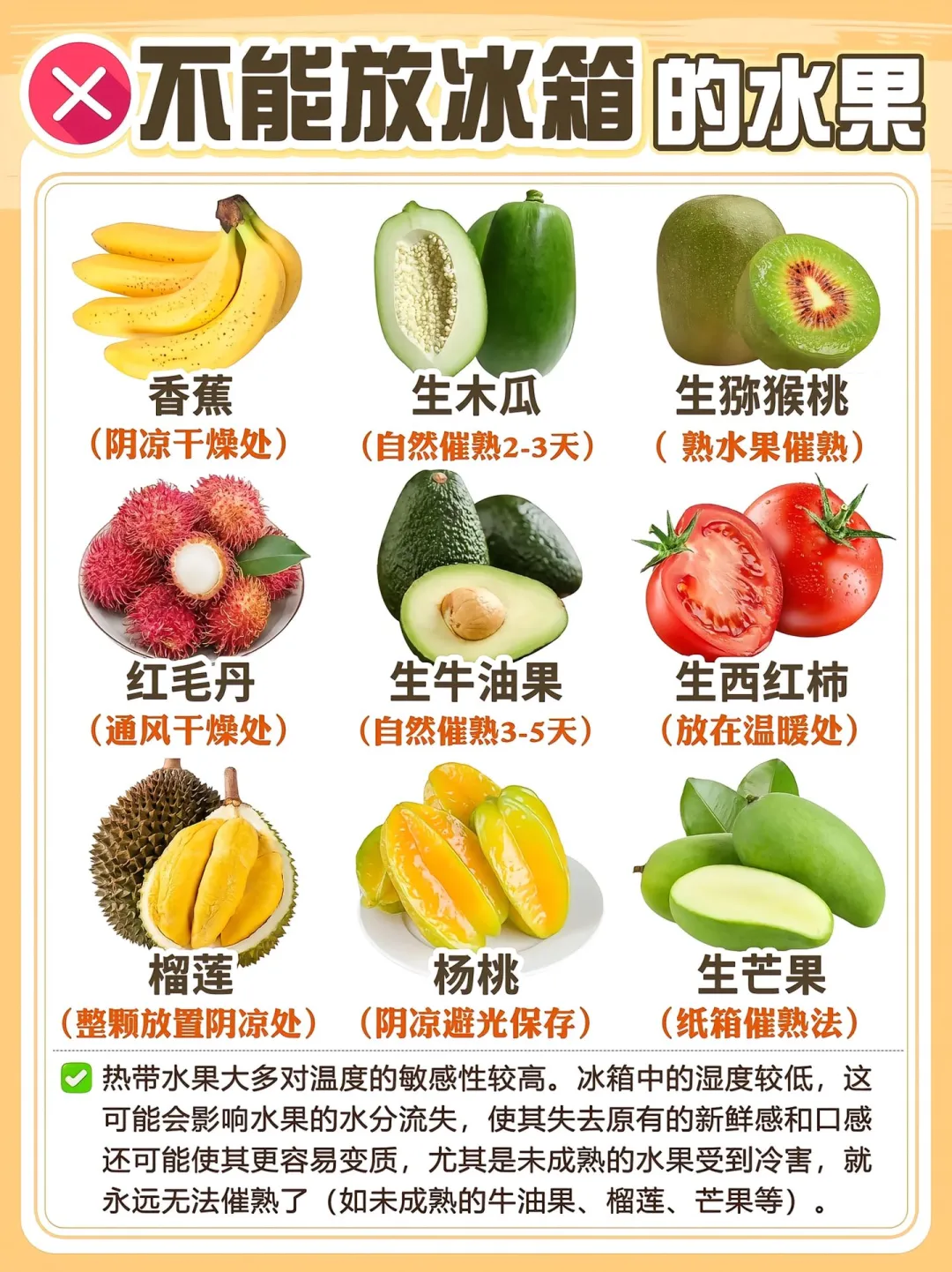 香蕉、生木瓜、生猕猴桃 这些热带水果大多怕冷,放冰箱容易冻伤变质。像生芒果可以用纸箱催熟法,让它慢慢成熟 。