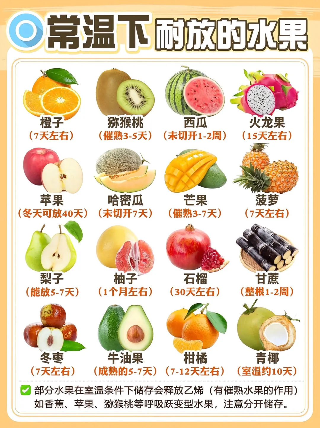 橙子、猕猴桃、西瓜 这些水果在常温下能存放挺久。像苹果,冬天能放40天 。不过要注意,部分水果比如香蕉、猕猴桃在常温储存时会产生乙烯,有催熟作用,最好把它们和其他水果分开存放哦~