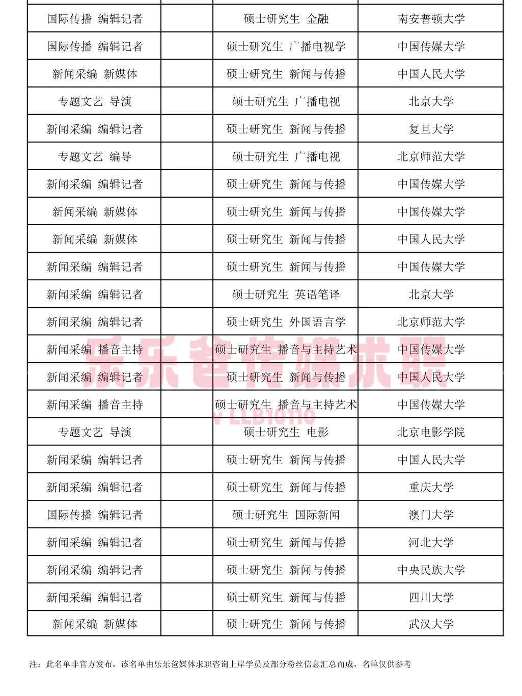 ✅此名单非官方发布,名单由乐乐爸媒体求职咨询上岸同学及粉丝信息汇总而成,此名单仅统计收获offer情况,非入职名单。 ❗️从名单上可以看出,近年来随着求职压力增大,学历也在水涨船高,录取的同学基本都是硕士学历。 ❗️从专业上看,以新闻传播为主,当然也有英语、金融等非新传专业。 ❗️最引人瞩目的是留学生的占比非常大,总台是非常喜欢要留学生的央媒没有之一,留学生同学一定要重点考虑该单位!