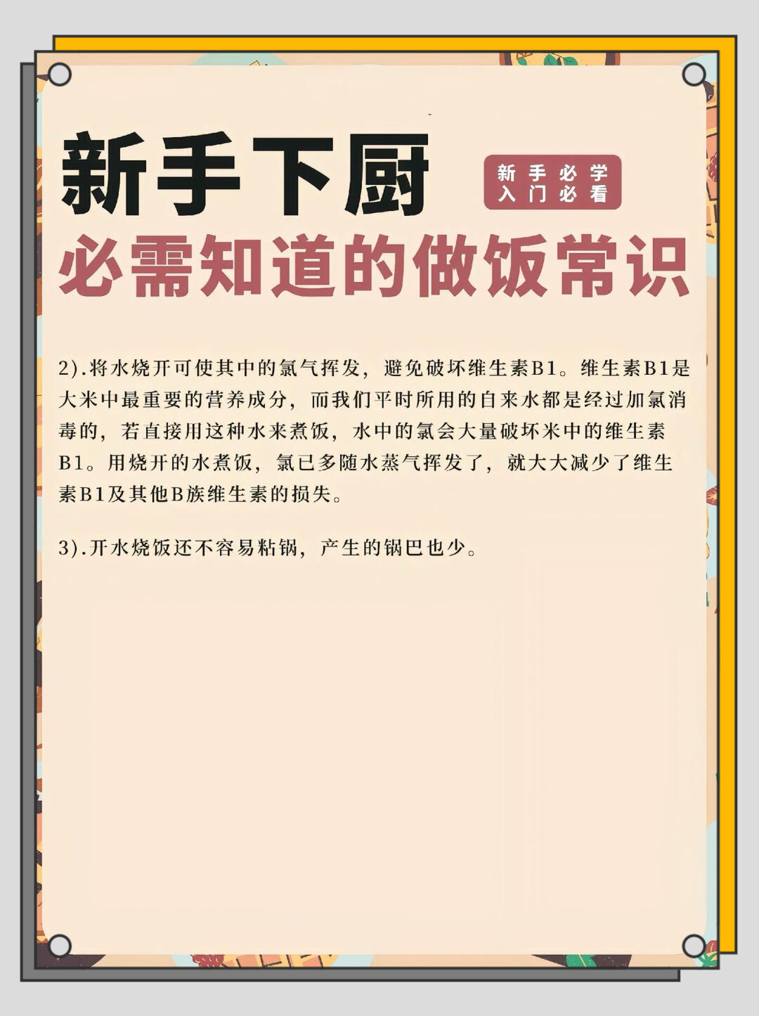 🍚 煮饭用水:别再用凉水煮饭啦!开水煮饭好处多,能缩短蒸煮时间,保护米里的维生素;还能让自来水里的氯气挥发,减少对维生素B1的破坏;而且不容易粘锅,锅巴也少~