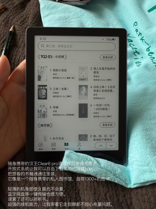 随身携带的汉王Clear6 pro满足我日常读书需求,开放式系统让我可以自由下载常用的阅读app,自带1300+的图书,它像是一个随身携带的私人图书馆,轻薄的机身即使久握也不会累,蓝牙网盘等一键传输也很方便。读累了还可以听听书。超强的续航能力,让我带着它走到哪都不担心电量问题。