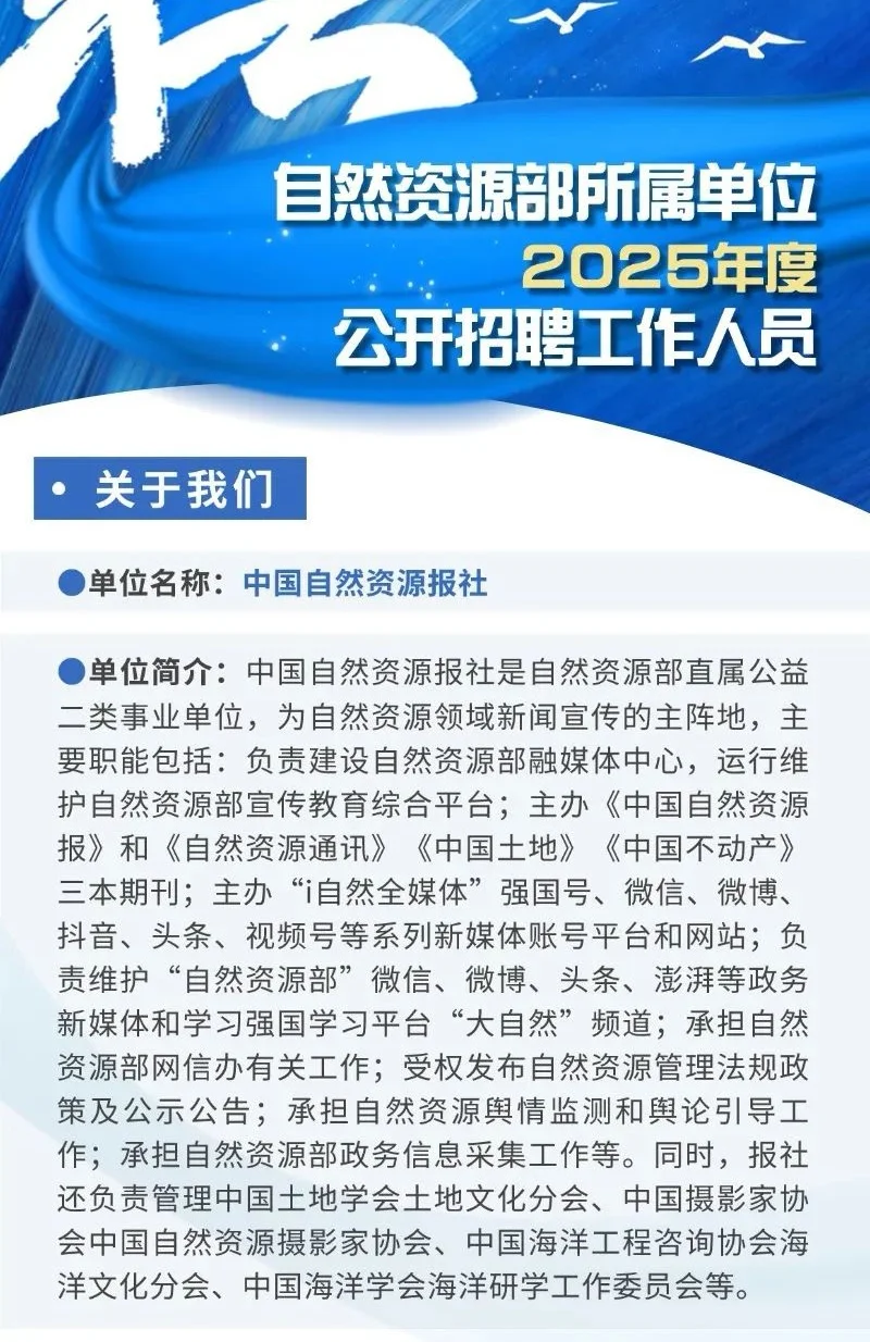 ✅自然资源报招人啦! 🎈本次共招收京内岗两名,京外岗一名,新传艺术生可报名!解决北京户口编制 ✌中国自然资源报社是自然资源部直属公益二类事业单位,为自然资源领域新闻宣传的主阵地,主要职能包括:负责建设自然资源部融媒体中心,运行维护自然资源部宣传教育综合平台;主办《中国自然资源报》和《自然资源通讯》《中国土地》《中国不动产》三本期刊;主办"i自然全媒体"强国号、微信、微博、、头条、视频号等系列新媒体账号平台和网站。
