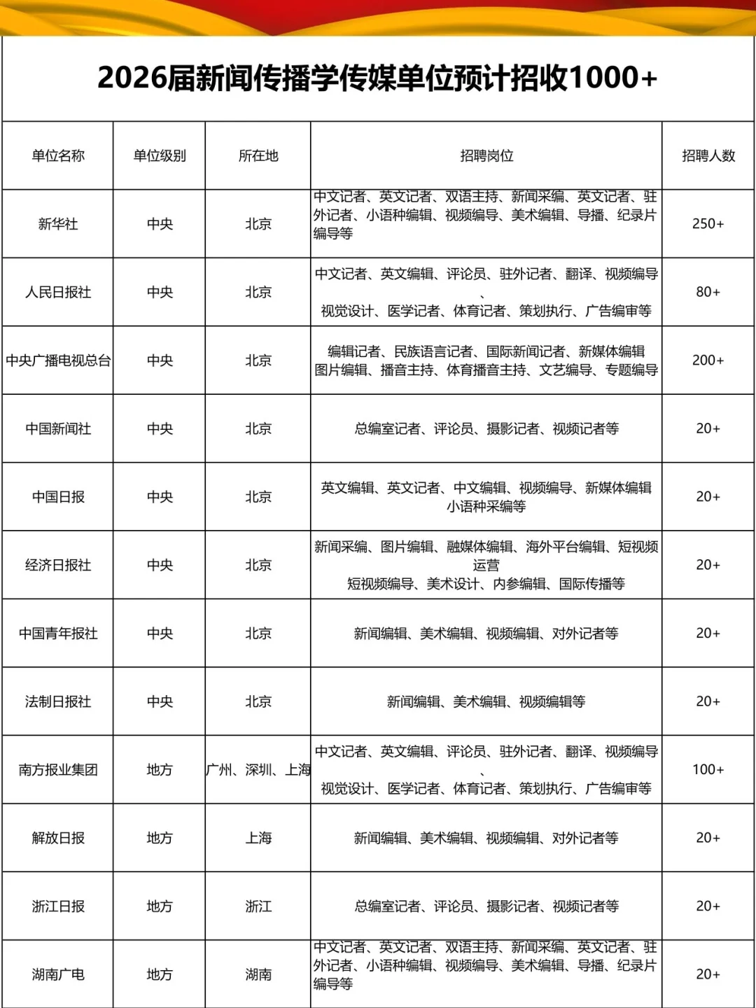 ✌进入八月,距离秋招开启还剩一个月,2026届媒体校招求职也即将开启,随着媒体单位业务扩展,岗位也在随之增多,新闻传播专业同学可报的岗位很多,今年预计招收超1000名应届毕业生!