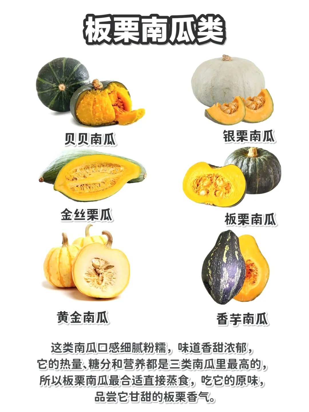 像贝贝南瓜、银栗南瓜、金丝栗瓜等都属于这类。它们口感细腻粉糯,味道香甜浓郁,仿佛自带板栗香气🌰。而且热量、糖分和营养在南瓜家族里都是佼佼者~最适合直接蒸着吃,原汁原味,每一口都能尝到那香甜的滋味!简直是“懒人美食”福音🥰。