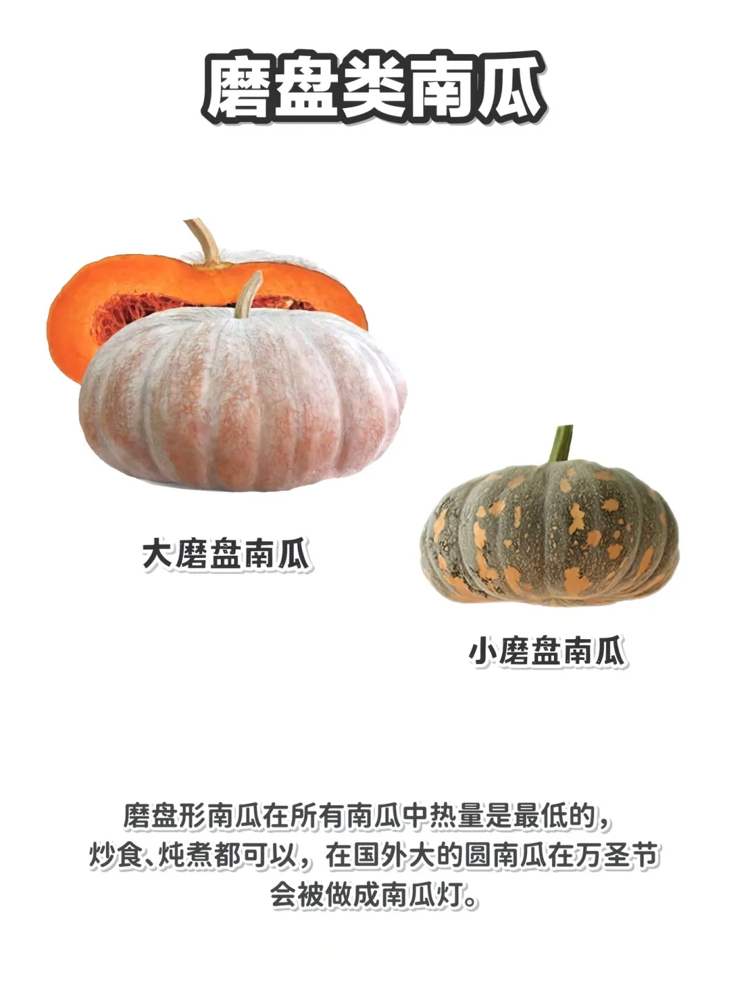 大磨盘南瓜和小磨盘南瓜,这俩热量在南瓜里是最低的。不管是炒着吃还是炖煮,都很合适。而且在国外,大的圆南瓜到了万圣节还能变身南瓜灯🎃,氛围感拉满!