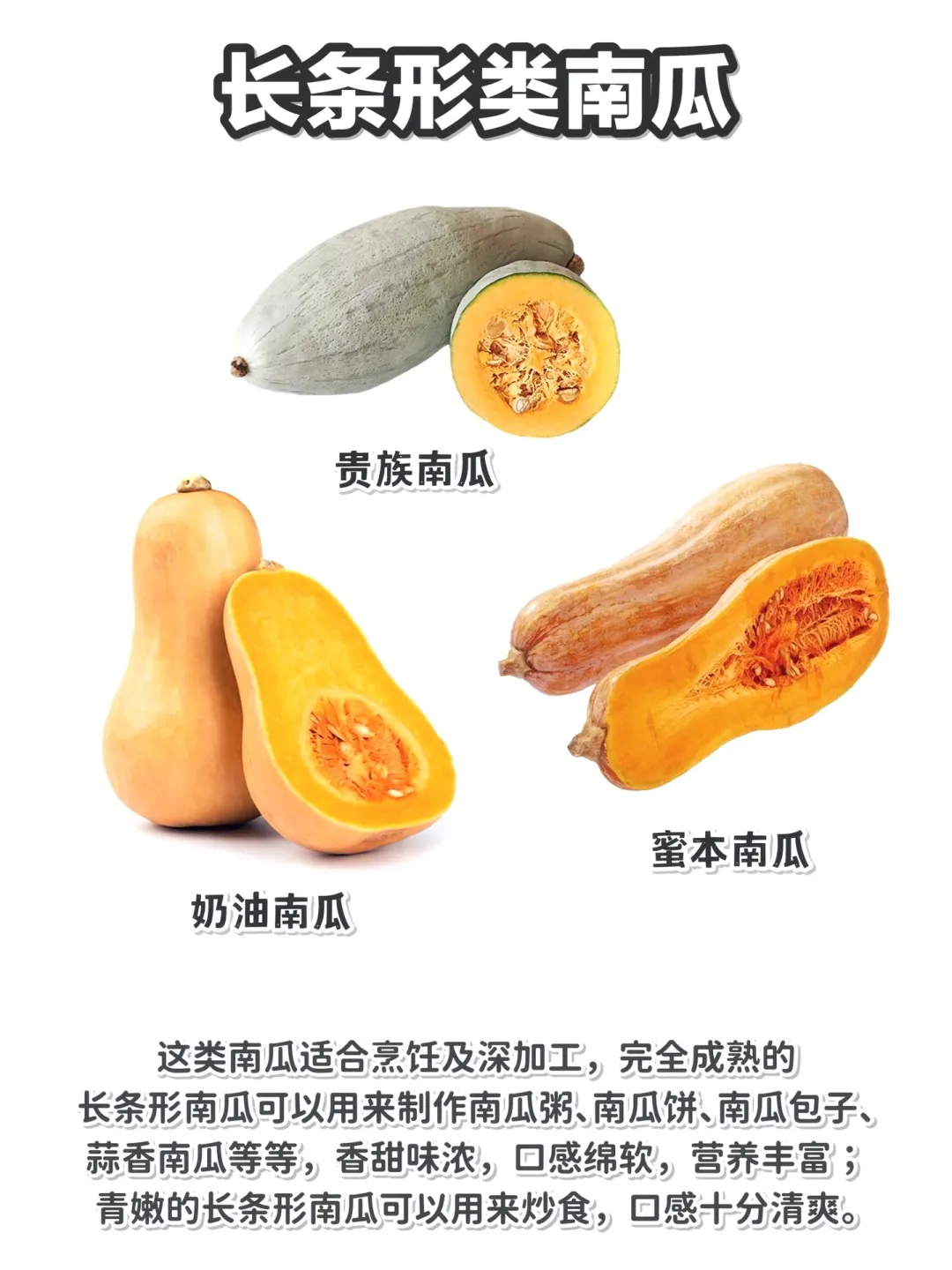 贵族南瓜、奶油南瓜、蜜本南瓜是代表。完全成熟的可以用来做南瓜粥、南瓜饼、南瓜包子等等,香甜味浓,口感绵软😋。青嫩的时候拿来炒着吃,清爽可口,别有一番风味~是厨房百变星君没错了!