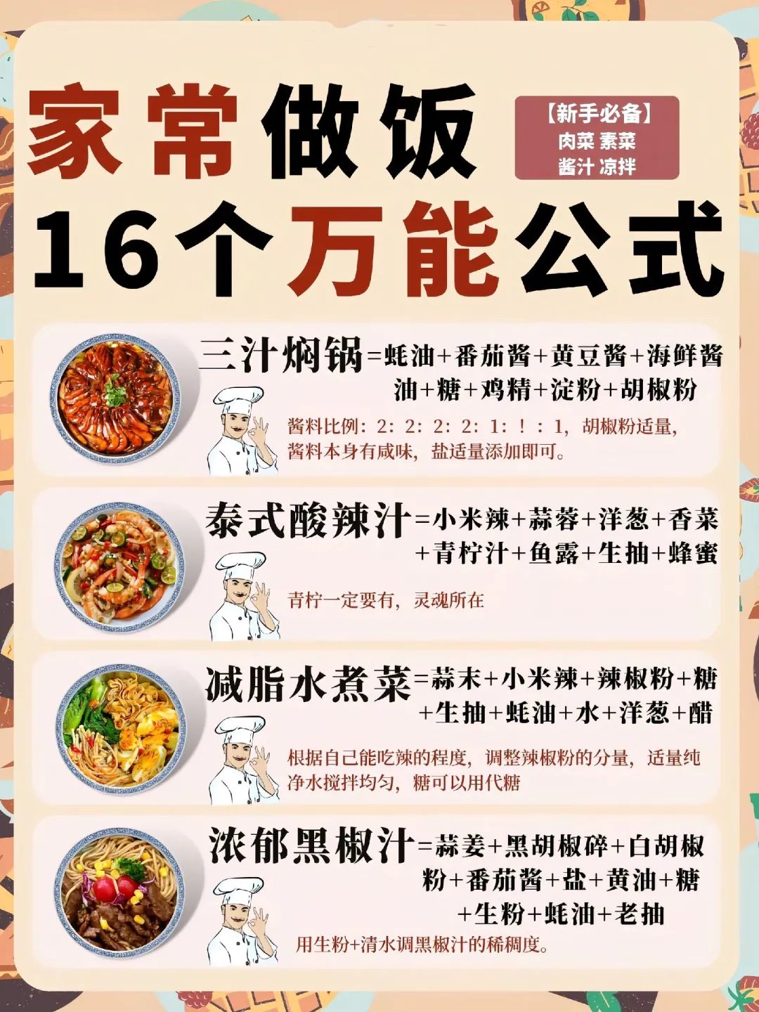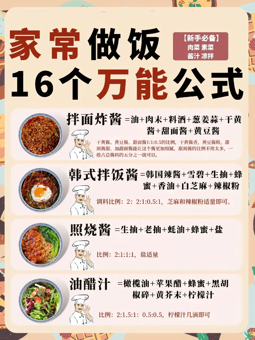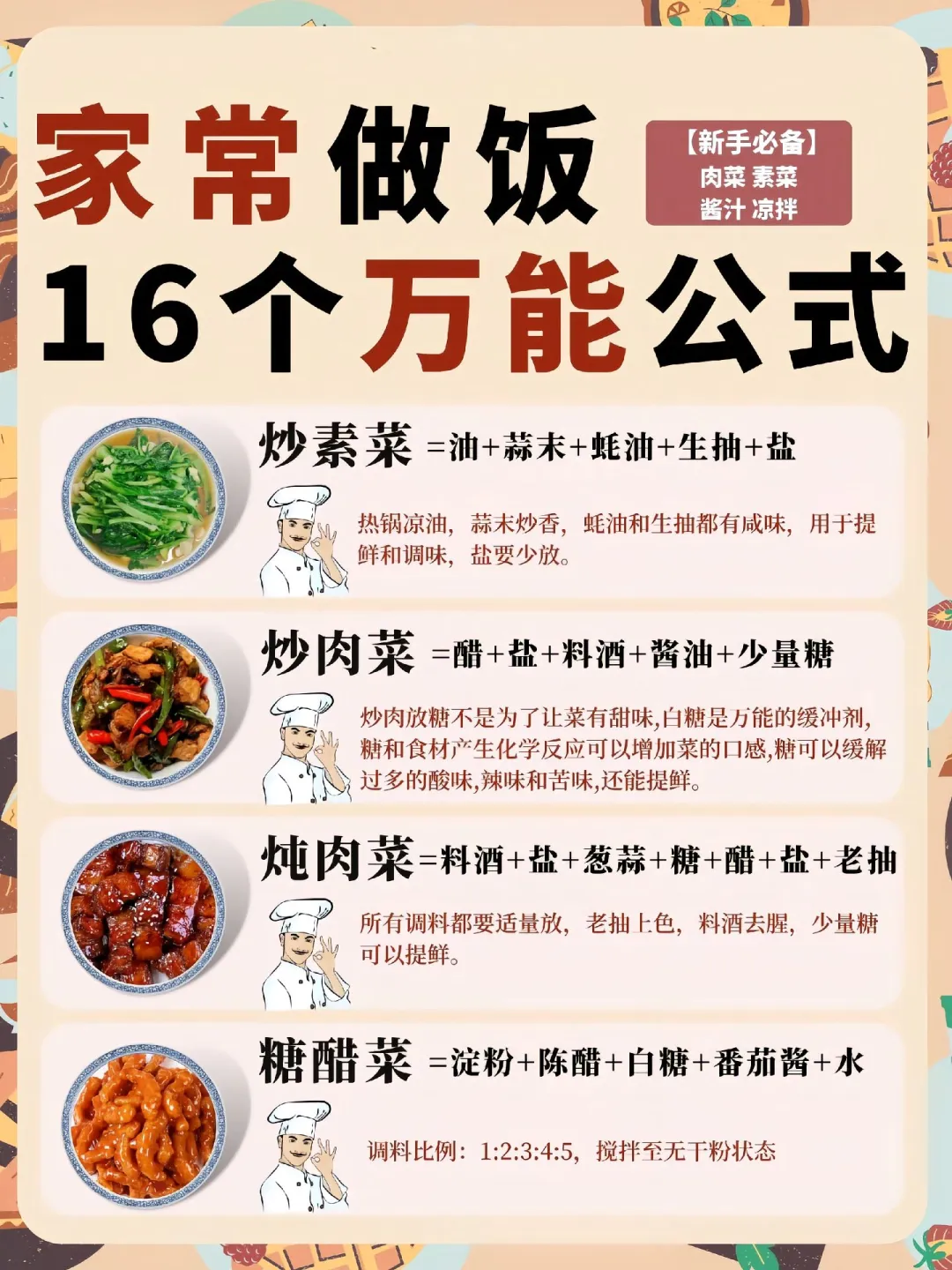 不会做饭星人有福啦!整理了超实用的16个家常做饭万能公式,涵盖肉菜、素菜、酱汁、凉拌,厨房小白也能变大厨~👇