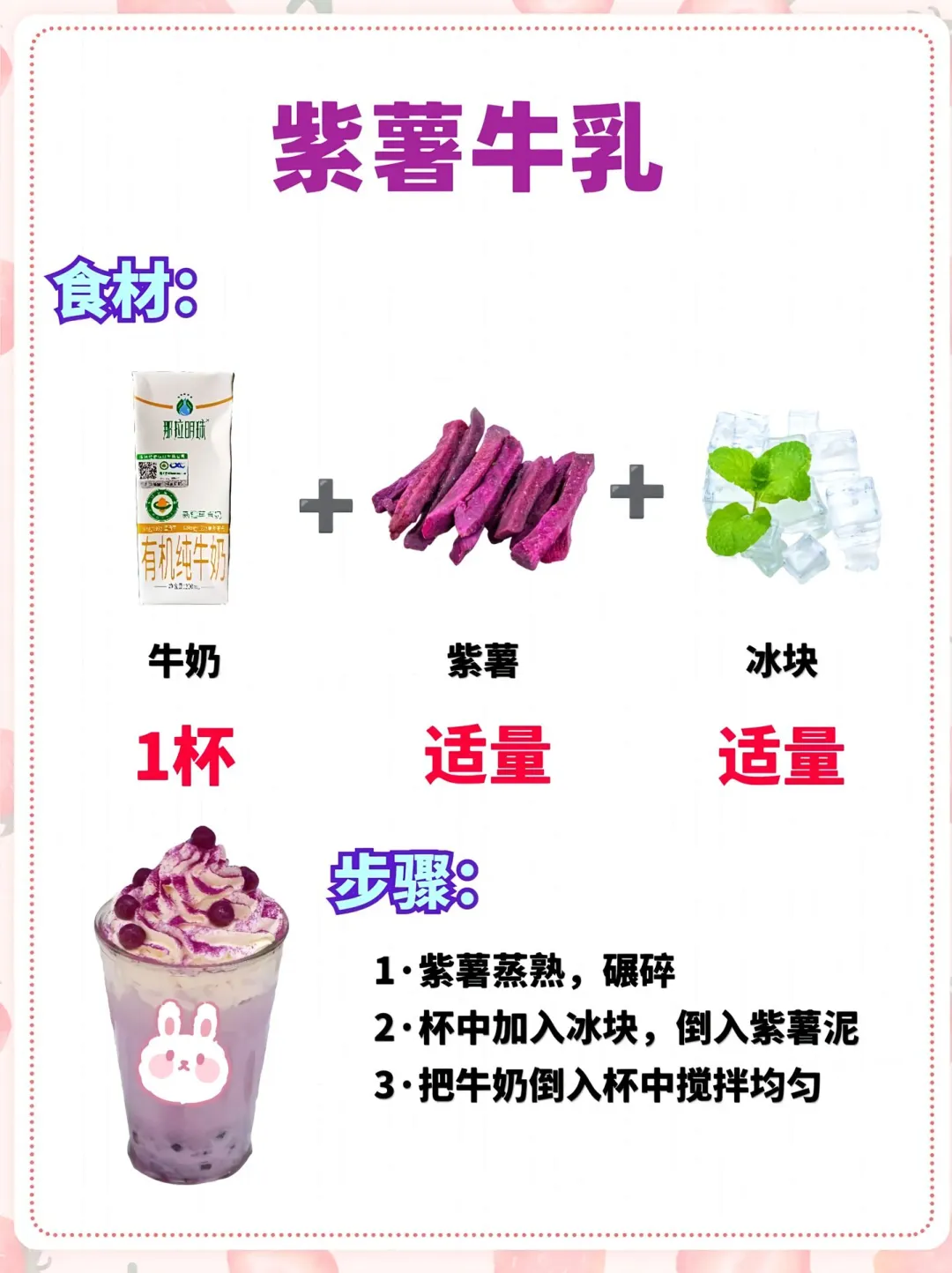 紫薯蒸熟压成泥,杯底铺满紫薯泥+冰块,倒入牛奶搅一搅!梦幻渐变紫超治愈,糯叽叽还能嚼到薯香~