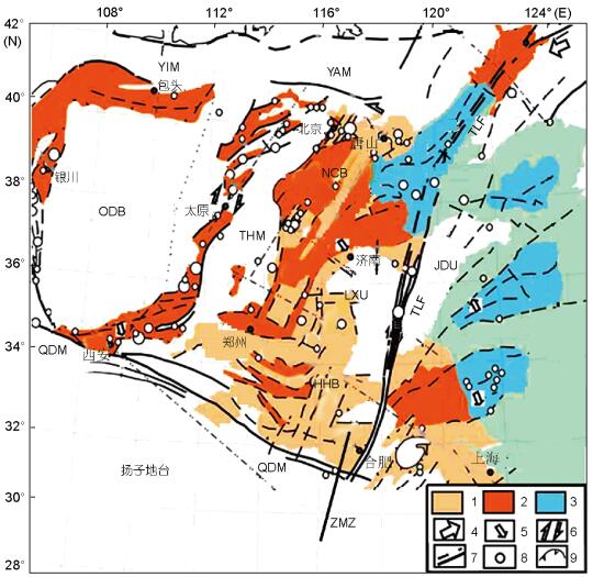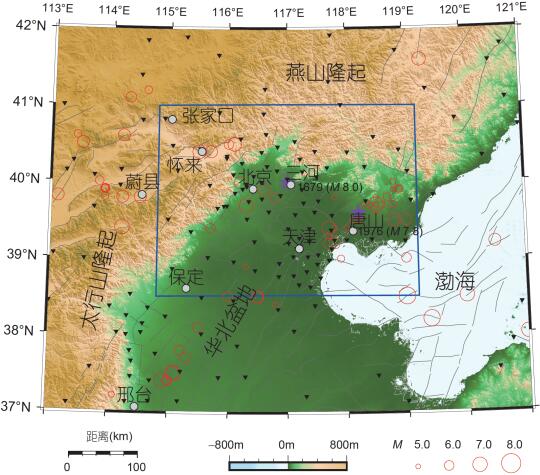 [一R]历史上北京及其周边区域频繁发生大地震(如图1所示), 例如发生于1679年北京东部的三河-平谷8.0级地震, 是该区域有史记载以来的最强烈地震,发生于1976年的唐山7.8级地震, 造成超过24.2万人死亡, 16.5万人重伤. 除了特大地震外, 5.0级以上的强震也时有发生, 例如1998年发生于张北的6.2级地震、2006年7月发生在文安的5.3级地震等. 北京及其周边区域的地震活动还具有周期性的特点(马文涛等, 2004), 每年有大量的小地震发生从地质构造的角度来看(如图2), 华北平原内冀中凹陷、临清凹陷、沧县隆起、黄骅凹陷、埕宁隆起等一系列构造单元自西向东呈北北东向相间排布, 大致与太行山隆起区及太行山山前断裂平行. 区域内还包含蔚县-延庆断裂、沧县断裂、昌黎-宁河断裂、太行山山前断裂等多个断裂带(吕作勇, 2009). 区域北部东西向的燕山隆起区地质构造相对稳定, 活断层主要集中在北东向的华北盆地内部和太行山隆起区。