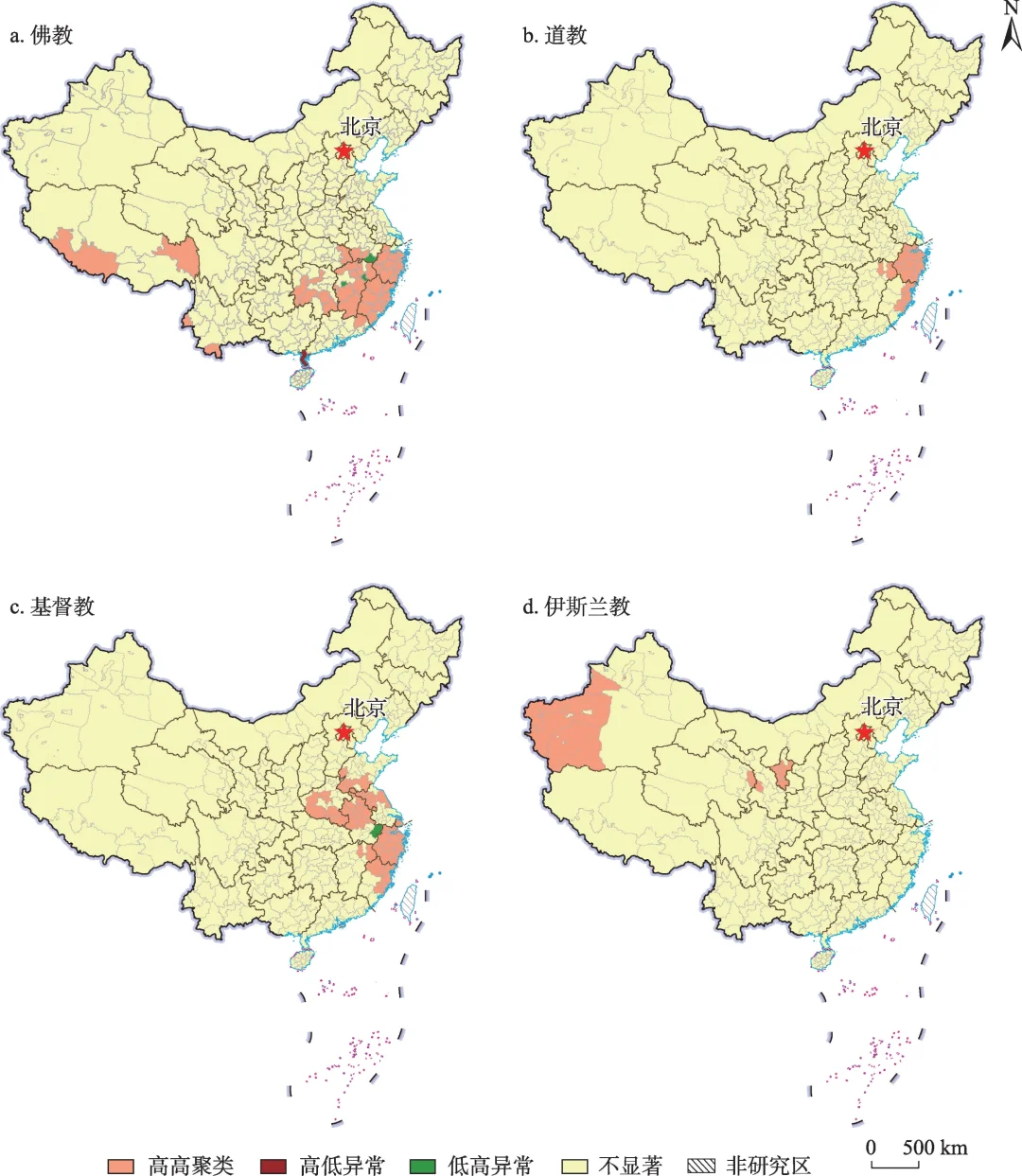 [三R]宗教分布具有显著的空间自相关特征,佛教和基督教的集聚程度高于道教和伊斯兰教。道教、佛教与基督教热点区多分布于东部地区,伊斯兰教热点区分布于西部地区;仅佛教与基督教在中国南部存在冷点区分布。