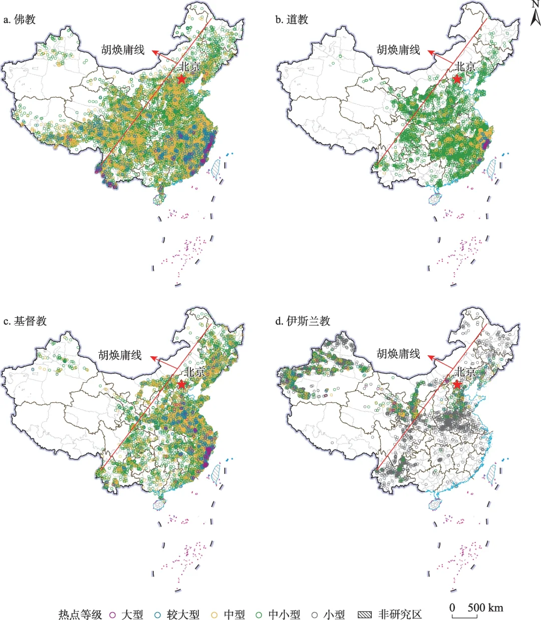 [一R] 佛教在中国的分布范围、分布密度与热点数量均较高,其次为基督教,道教与伊斯兰教稍低。