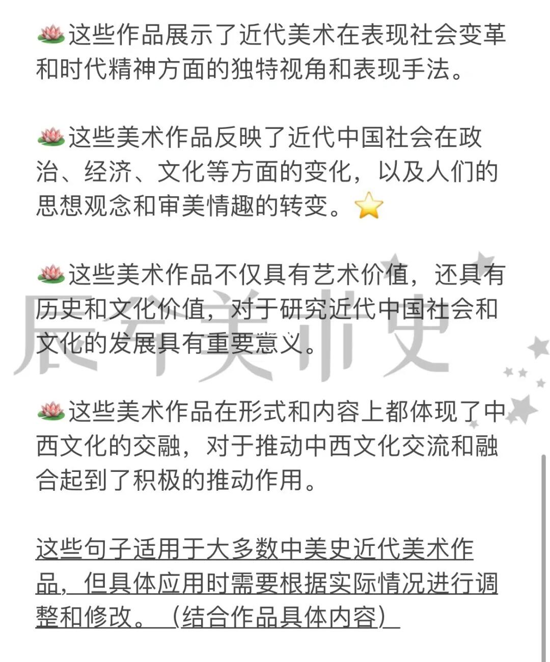 要注意,这些句子适用于大多数中美史近代美术作品,但具体应用时需要根据实际情况进行调整和修改。(结合作品具体内容)但是非常干货,可以多多收藏,总结成一个适合自己的句子呦~