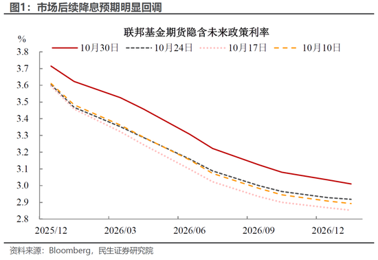 另一方面,鲍威尔在新闻发布会上也进一步强调,“9-10月的降息是风险管理式降息,12月会议上进一步降低政策利率并非必然结果”,“越来越多官员希望推迟降息,认为至少应该等待一个周期”,罕见的对市场宽松预期降温,反映出联储对于政府关门下数据缺失以及关税影响下通胀上行的担忧。