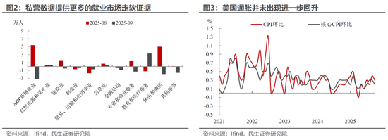 具体来看,就业下行和温和的通胀组合下,美联储10月如期降息25bp。9月以来就业市场风险进一步加剧,虽然缺少官方数据支撑,但ADP等私营部门就业数据已提供更多劳动力市场走软的证据,而通胀数据也并未成为降息的“拦路虎”,这基本锁定了10月降息的可能,短期内可优先降息缓解就业问题。