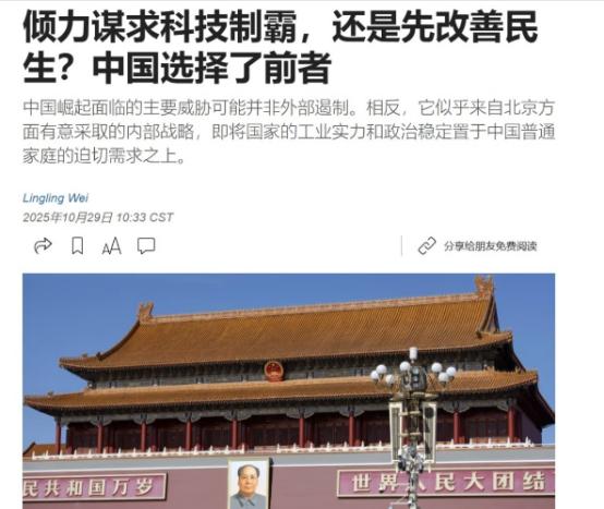 美媒声称中国的做法,完全错误了!10月29日,华尔街日报刊文声称,中国现在的做法,这是选择继续以科技与制造业为核心驱动力,而不是优先改善民生和刺激内需。北京在26年至30年的发展蓝图中,号召全国动员,采取“超常规措施”在半导体等关键技术上实现决定性突破,以加快科技自立自强进程。 搞科技、做制造业从来不是跟民生对着干,反而是让老百姓日子过好的最硬底气。现在老百姓要的民生,早不是“能吃饱穿暖”这么简单了,大家要的是靠谱的工作、稳当的收入、更好的公共服务,这些事哪一样离得开过硬的科技和制造业? 就说就业吧,中国新能源汽车连续10年全球卖得最多、造得最多,从研发、生产到卖车、售后,整个产业链撑起来几千万人的饭碗,这难道不是民生? 国内搞人工智能的公司都超过5300家了,在芯片、算法这些地方的突破,催生出智能客服、数据标注、AI训练师这些新行当,这不就是给大家找新的挣钱路子? 再往农村看,智慧灌溉设备、无人机播种这些新鲜玩意,都是制造业跟科技凑一块搞出来的,有了这些技术,农民不用再“看天吃饭”,收入稳了,这不就是民生变好了? 《华尔街日报》说中国不优先刺激内需,可他们忘了最基本的一点:没有扎实的产业打底,内需就是飘在天上的空话。老百姓愿意花钱,要么是能买到物美价廉的好东西,要么是手里有钱敢花,这两样都得靠产业撑着。 就拿买家电来说,以前大家买高端家电都认进口的,现在国产品牌靠着芯片和智能技术的进步,做出来的冰箱更省电、洗衣机更聪明,价格还更实在,老百姓自然愿意买。 这两年家电下乡、以旧换新能火起来,拉动那么多消费,靠的不就是制造业升级?再看新能源汽车,以前国产车在市场上没话语权,现在靠着电池、智能驾驶技术的突破,不光国内卖得火,还卖到了欧洲、东南亚,咱们自己人买得起、用得舒心,这才是最实在的刺激消费 要是像有些国家那样,制造业空心化,连个拿得出手的本土产品都没有,老百姓要么买贵得离谱的进口货,要么买劣质次品,内需怎么拉得起来? 再说说用“超常规办法”攻半导体这些关键技术,这恰恰是为了长远保民生、稳内需。这些年咱们受“卡脖子”的气还少吗?国外一断芯片供应,国内手机、汽车厂就减产,一减产就得裁员,老百姓的饭碗就不稳;医疗设备里的高端芯片靠进口,导致不少先进诊疗设备卖得死贵,普通人家看病成本都高了不少。 2024年咱们人均GDP突破1.3万美元了,要想再往上走,让老百姓享受到更好的医疗、教育,就得把关键技术攥在自己手里。就像“十五五”规划里说的,要搞新质生产力,这新质生产力不是凭空冒出来的,就是靠半导体、人工智能这些关键技术撑起来的。 等咱们在这些领域真搞出突破,芯片价格降下来,医疗设备成本低了,手机、汽车这些消费品质量更好,老百姓花钱少了、挣钱路子多了,民生和内需自然就上去了,这才是从根上把问题解决了。 而且中国从来没说过不重视民生,这些年在民生上花的钱、干的事摆在哪呢。脱贫攻坚让近一个亿的农村贫困人口脱了贫,基本养老保险覆盖了10亿多人,基本医保更是覆盖了13.6亿人,这么大规模的民生投入和成效,全世界都少见。 但咱们心里清楚,单靠财政补贴搞民生,只能解燃眉之急,要让民生保障能长久,还得靠产业发展自己“造血”。 就说嫦娥七号、八号要发射,表面看是搞航天,实际上带动了新材料、精密制造一大堆产业发展,这些技术用到民用领域,就能造出更好的医疗器械、更先进的工业设备,最后受益的还是老百姓。 美媒会有这种错误说法,说到底,就是用西方的发展路子硬套中国的情况。他们习惯了先搞消费再建产业,却忘了中国作为后发国家,得先把产业根基打牢了,才能稳稳当当发展。 美国自己,不也搞芯片法案,砸了上千亿美元扶本土半导体产业吗?怎么到中国搞产业升级,就成“错误”了?这双重标准玩得也太溜了。 说到底,中国的发展路子很明白:靠科技和制造业升级给大家找好工作、涨收入,靠好产品、好服务让大家愿意花钱,再用消费反过来推动产业更上一层楼,形成一个良性循环。 “十五五”规划里这么部署,不是不管民生的冒进,而是把眼前过好日子和长远有保障结合起来的精明打算。 《华尔街日报》要是真关心中国老百姓的日子,不如好好看看咱们的就业数据、收入变化,看看货架上越来越多的国产品牌,别闭着眼睛说瞎话。毕竟,日子过得好不好,不是外媒一张嘴说了算的,是老百姓实打实的感受。