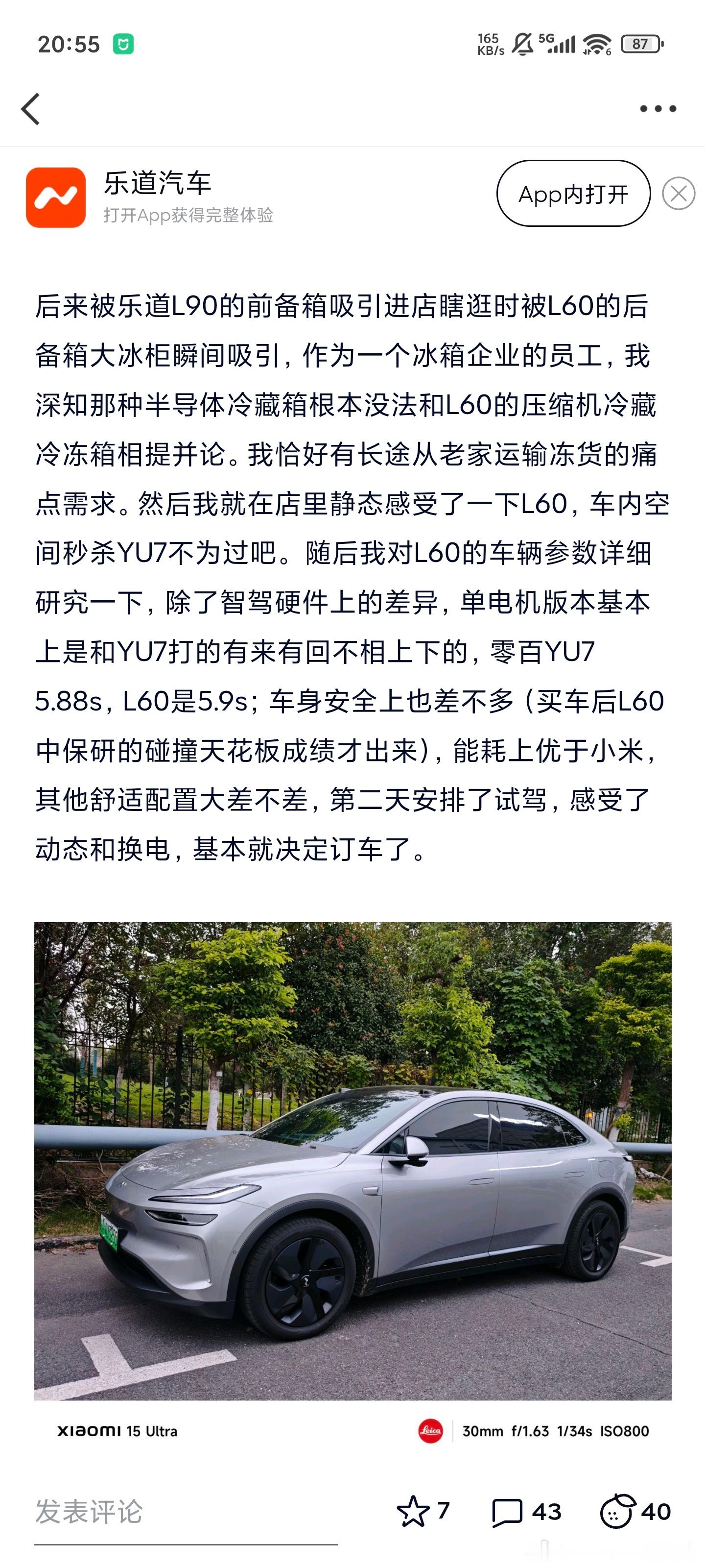 15年纯米粉放弃小米YU7选择乐道L60,原因是空间小[允悲]
