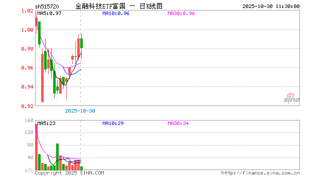 10月30日,截止午间收盘,金融科技ETF富国(515720)跌1.01%,报0.980元,成交额958.23万元。金融科技ETF富国(515720)重仓股方面,同花顺截止午盘跌3.85%,东方财富跌1.51%,指南针跌3.89%,恒生电子跌0.64%,润和软件涨1.34%,东华软件涨0.49%,银之杰跌2.40%,新大陆跌0.68%,广电运通涨0.00%,四方精创跌3.62%。