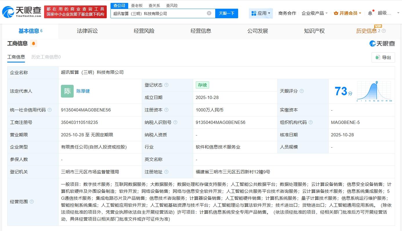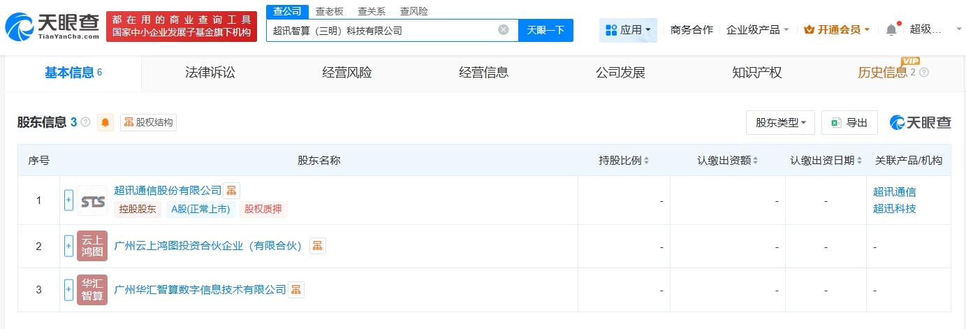天眼查App显示,近日,超讯智算(三明)科技有限公司成立,法定代表人为陈厚健,注册资本1000万元人民币,经营范围包括数字技术服务、互联网数据服务、大数据服务、数据处理和存储支持服务、人工智能公共数据平台等。股东信息显示,该公司由超讯通信(603322)、广州云上鸿图投资合伙企业(有限合伙)、广州华汇智算数字信息技术有限公司共同持股。