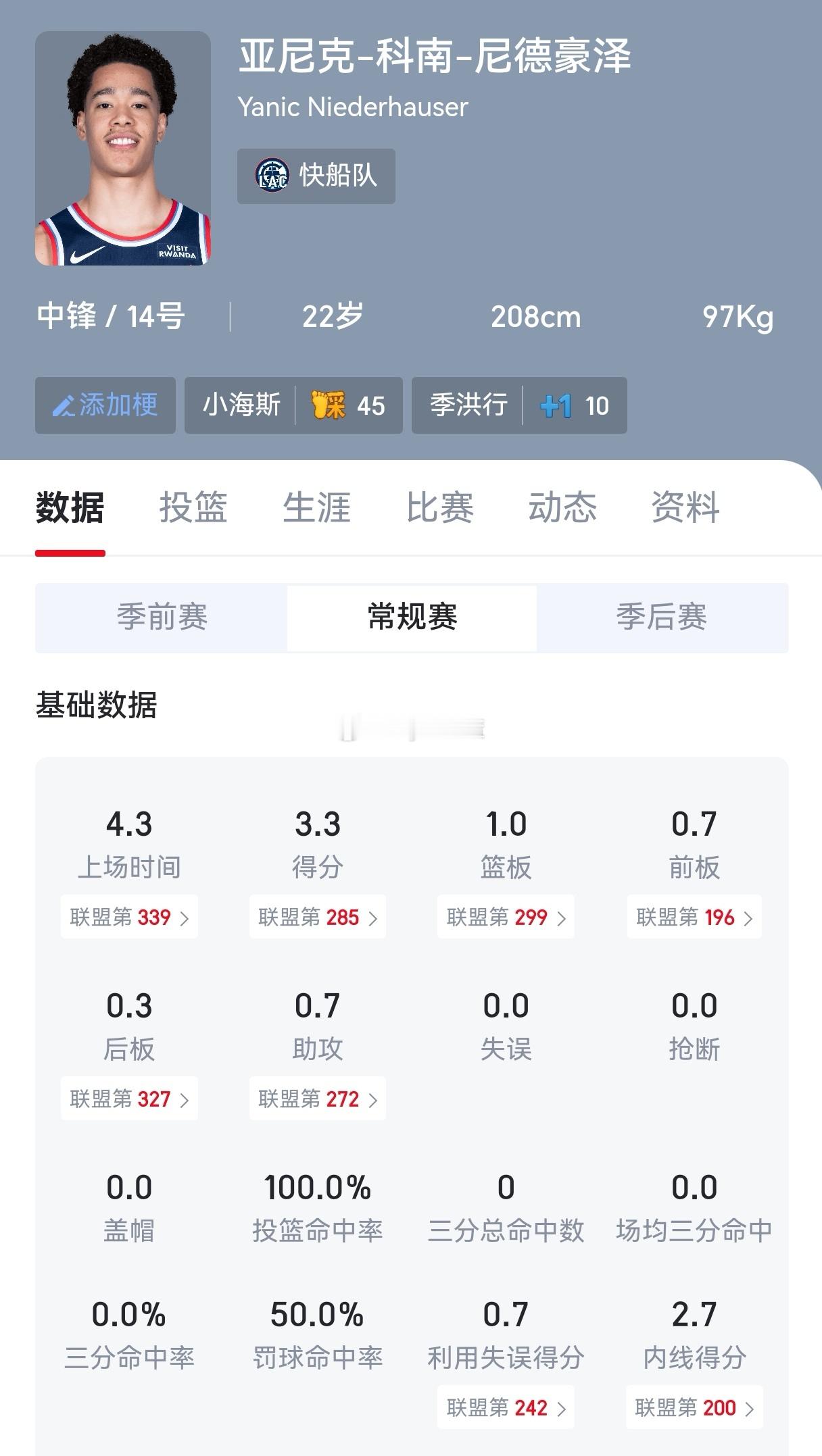 30顺位亚尼克,4场比赛打了3场,场均4.3分钟3.3分1篮板。