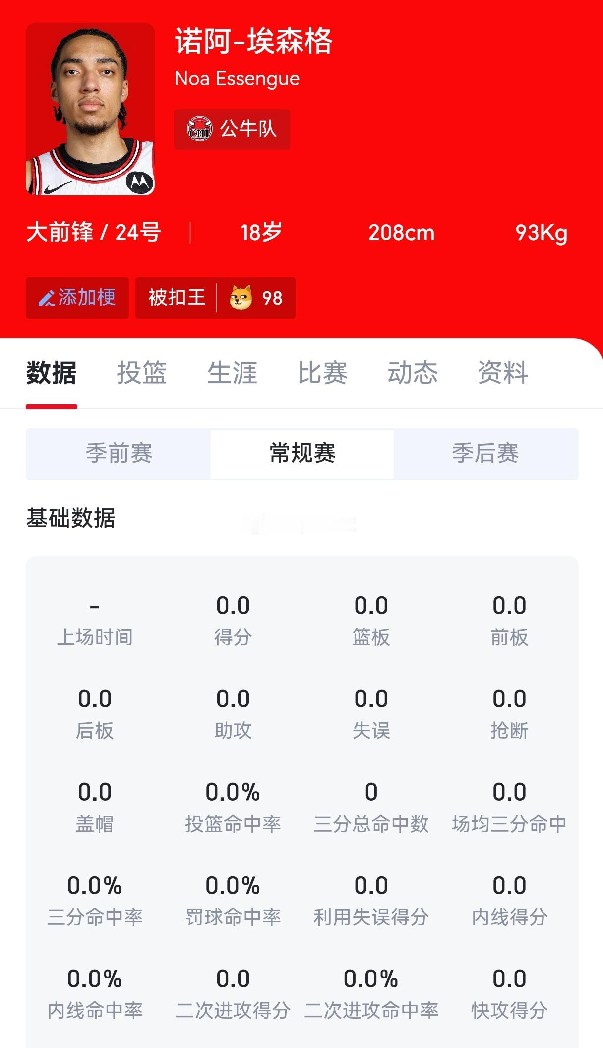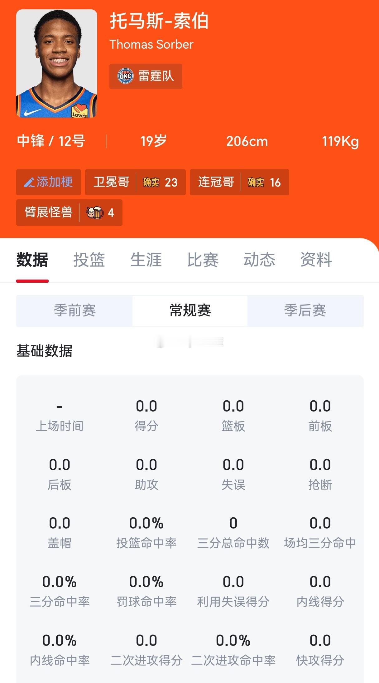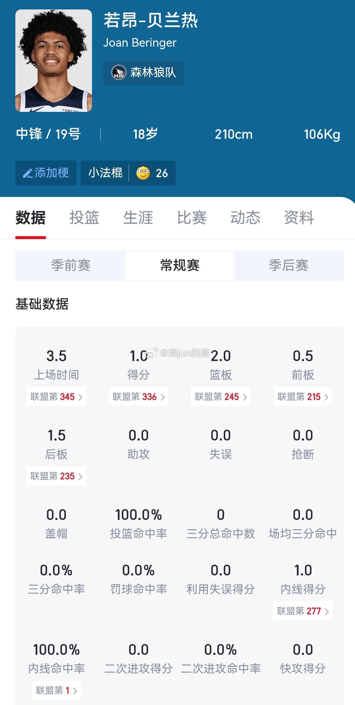 17顺位贝兰热,4场比赛只打2场,场均3.5分钟1分2篮板。