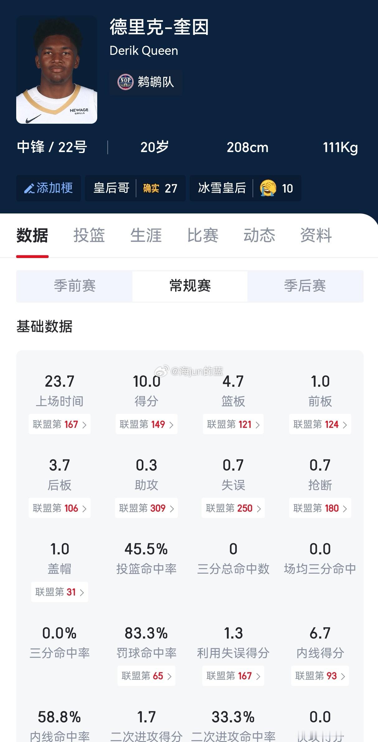 13顺位奎因,场均23.7分钟10分4.7篮板,投篮命中率45.5%。