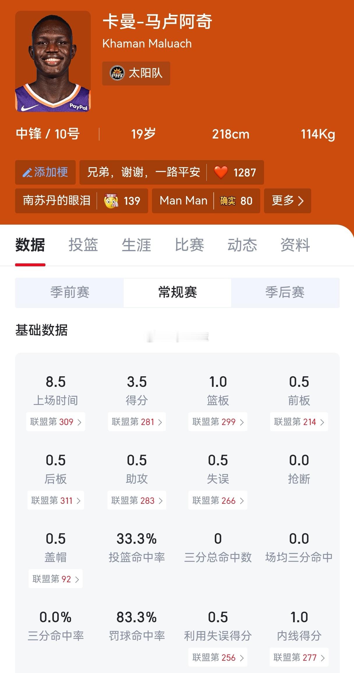 10顺位马努阿奇,4场比赛只打2场,场均8.5分钟3.5分1篮板,投篮命中率33.3%。