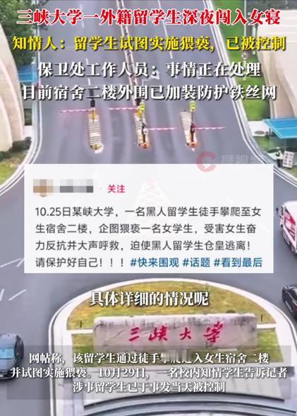 这样的渣宰是谁放进来的? 昨天,一则“留学生深夜闯入女寝,试图对女生实施猥亵”的新闻冲上热搜,引起众多讨论。 据说事发后,学校迅速做出反应,开除这名学生的学籍,并把女寝二楼外围加装防护铁丝网,而辖区派出所表示当晚就已经找到涉事留学生,案件还在处理之中,肯定会依法处置。 看到有知情人爆料,有说这人是个黑人,也有说是个印度裔的,不管是什么人,反正是个留学生没跑。 看到这个新闻,我一点都不意外会发生这样的事情,这些年一些学校为了所谓的国际排名,不顾公平,不管什么脏的臭的都往学校招。 这件事情让人愤怒,但是某些部门是否该反思,招留学生要把关学生的品行,不要什么人都要,不然只会让本国人愤恨。