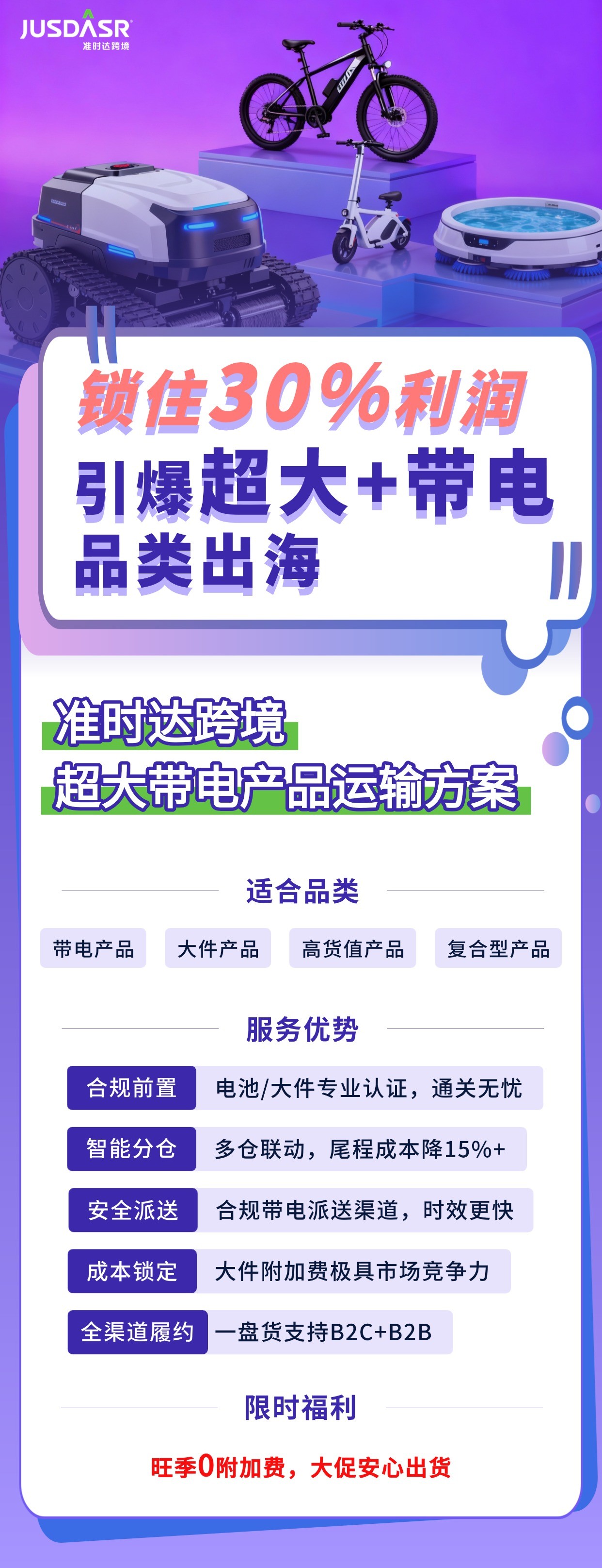 面对“超大带电”品类出海的一系列系统性难题,零散的优化已不足以应对。领先的卖家正从战略层面,通过构建韧性的供应链体系来实现突围。准时达跨境针对带电产品、大件产品、高货值及复合型产品,推出全方位运输方案,助您锁定利润,稳健增长。