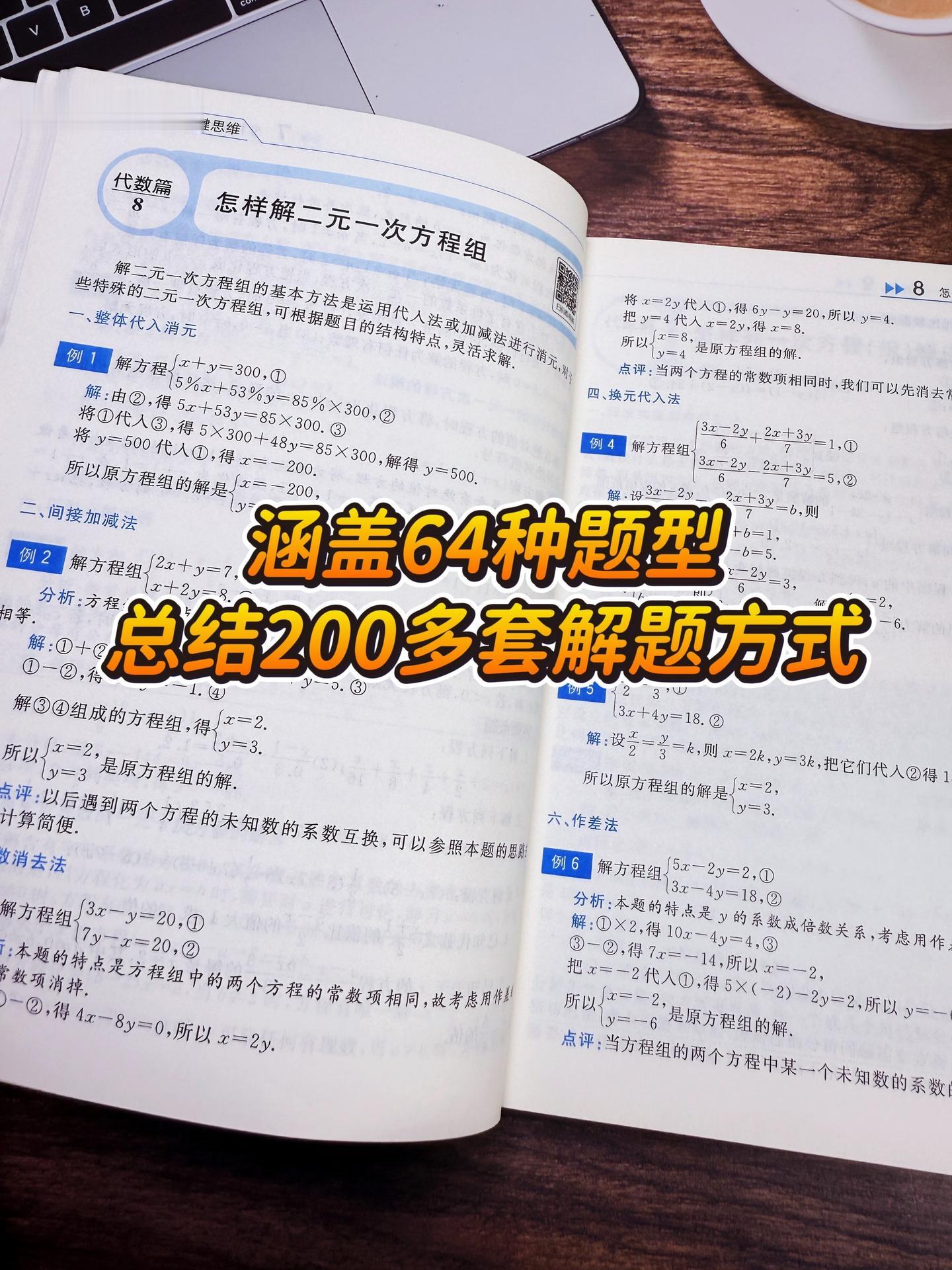 原来这就是学霸秘籍呀❗❗❗。初中数学 不管怎么变,也就这64种解题方法,掌握了做题就会又快又准,这本初中数学解题关键思维 都给你梳理好了,比如解二元一次方程的6种方法,二次函数解析式的3种方法以及三角形几何证明的7种方法等,非常全面!