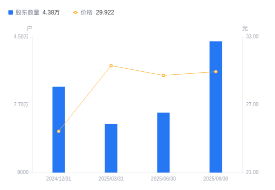 日期A股户数(户)流通A股户均持股数(股)户均持股市值(万元)2025-09-304380310232.1830.622025-06-302492217984.1153.222025-03-312182820533.2662.532024-12-313179014098.7734.762024-09-304027711127.9427.992024-06-304182710715.5720.922024-03-312950215192.1945.182023-12-313526712708.7632.502023-09-30482449290.2719.962023-06-30477529385.9926.28