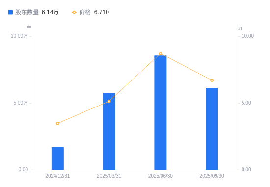日期A股户数(户)流通A股户均持股数(股)户均持股市值(万元)2025-09-306139016040.1610.762025-06-308553211512.7110.032025-03-315774817052.668.772024-12-311701557875.8120.142024-09-301751256271.5119.862024-06-301801054715.5316.852024-03-311597861600.7924.022023-12-311630560365.3830.482023-09-301284976601.8743.822023-06-301150185580.1668.29