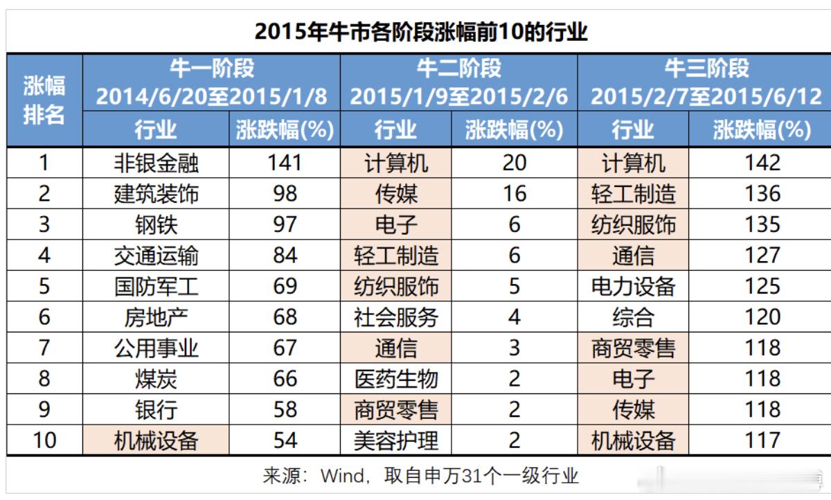 2015年牛市,核心主线是一带一路和互联网+。金融、基建在牛一阶段领涨,扭转市场悲观情绪;牛二和牛三是互联网+主线,计算机、电子、传媒等表现亮眼。本轮牛市主线明确,不存在高切低现象。