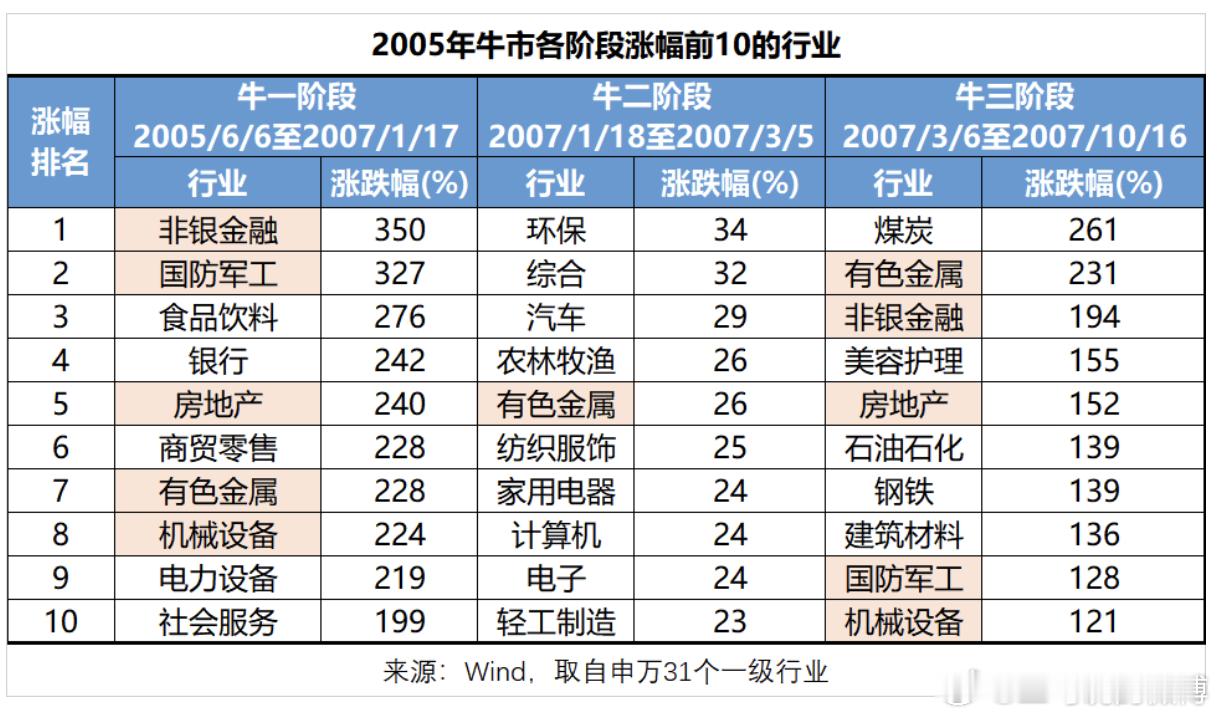 2005年牛市,主线是金融、地产、煤炭、有色“四朵金花”。这些行业在牛一阶段领涨,牛二休整,牛三继续领涨。即在牛二阶段存在高切低现象,但低位板块补涨力度有限。