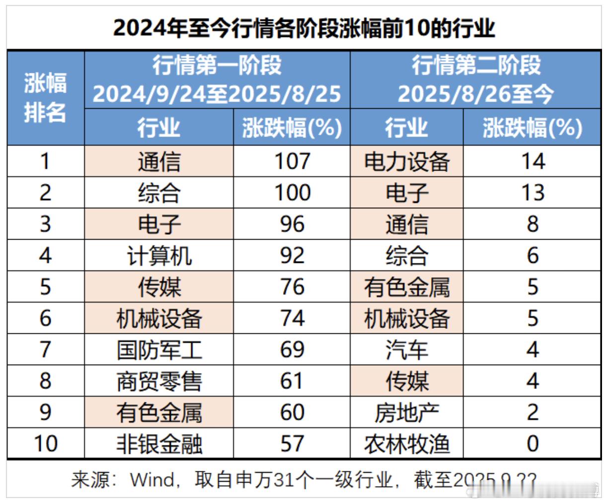 2024年“9.24”行情的核心主线是AI+为代表的新质生产力,通信、电子、计算机、传媒等在第一阶段领涨(2024.9.24至2025.8.25)。在进入第二阶段后(2025.8.26至今),部分落后行业出现补涨行情。不过除了电力设备,其他行业补涨力度不大。在国庆节之后的几个交易日,市场波动较大。部分“小登资产”有所回调,“老登资产”有所上涨,但持续性有待观察。