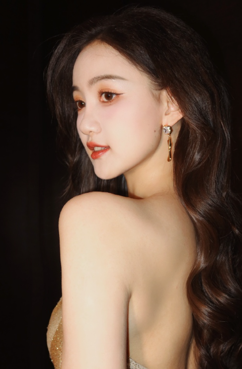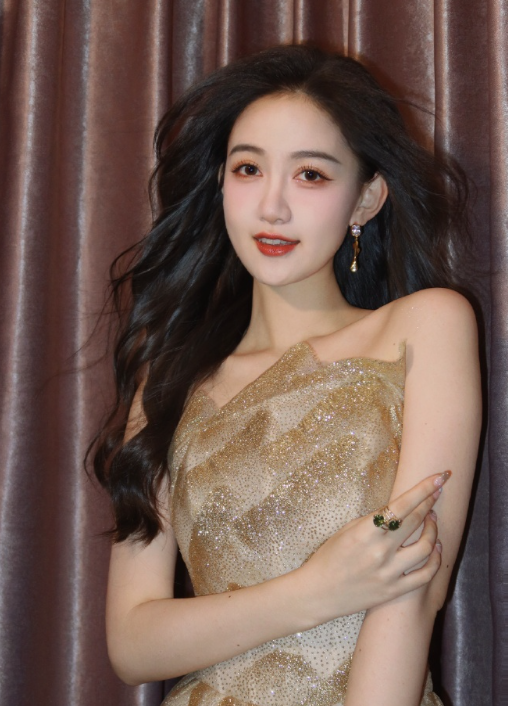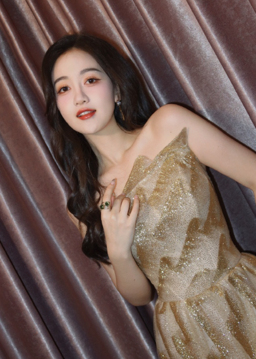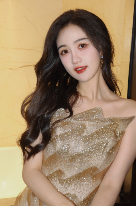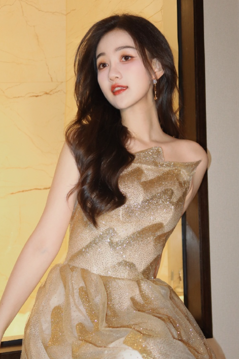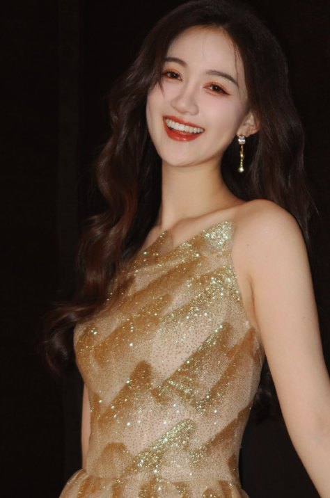 马萱卷发红唇金色礼裙,甜笑怡人