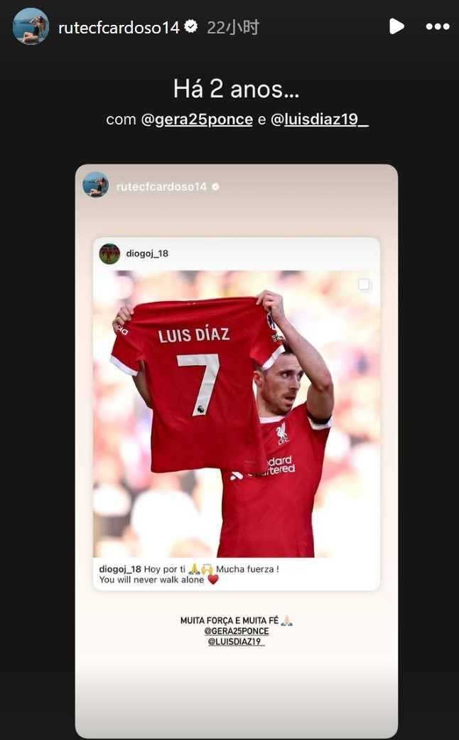 鲁特转发了若塔在2年前高举迪亚斯7号球衣声援后者的照片,她也不禁感叹道:“2年前…”