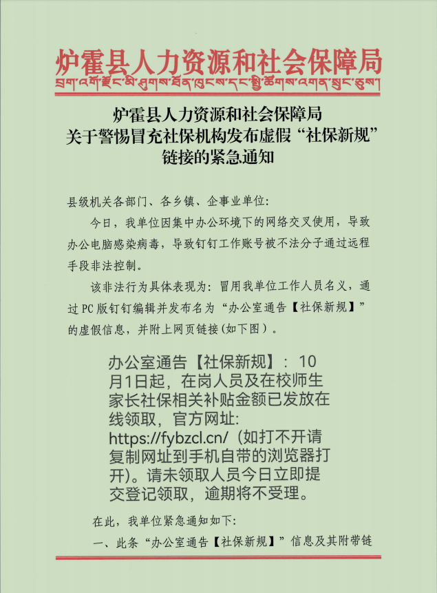 10月30日,四川省炉霍县人力资源和社会保障局通过微信公众号,向当地县级机关各部门、各乡镇、企事业单位发去紧急通知,提醒警惕冒充社保机构发布虚假“社保新规”链接。
