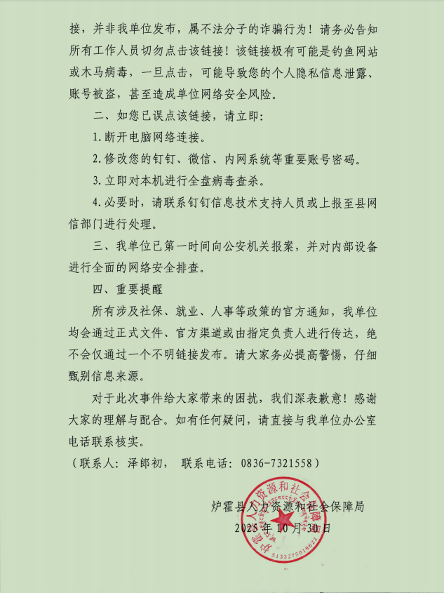 炉霍县人社局微信公众号公布的通知指出,该非法行为具体表现为,冒用该单位工作人员名义,通过PC版钉钉编辑并发布名为“办公室通告[社保新规]”的虚假信息。此条“办公室通告[社保新规]”信息及其附带链接,并非县人社局发布,属不法分子的诈骗行为!请务必告知所有工作人员切勿点击该链接!该链接极有可能是钓鱼网站或木马病毒,一旦点击,可能导致您的个人隐私信息泄露、账号被盗,甚至造成单位网络安全风险。