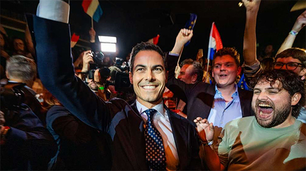 荷兰六六民主党领袖罗布·耶滕与支持者一起庆祝。社交媒体