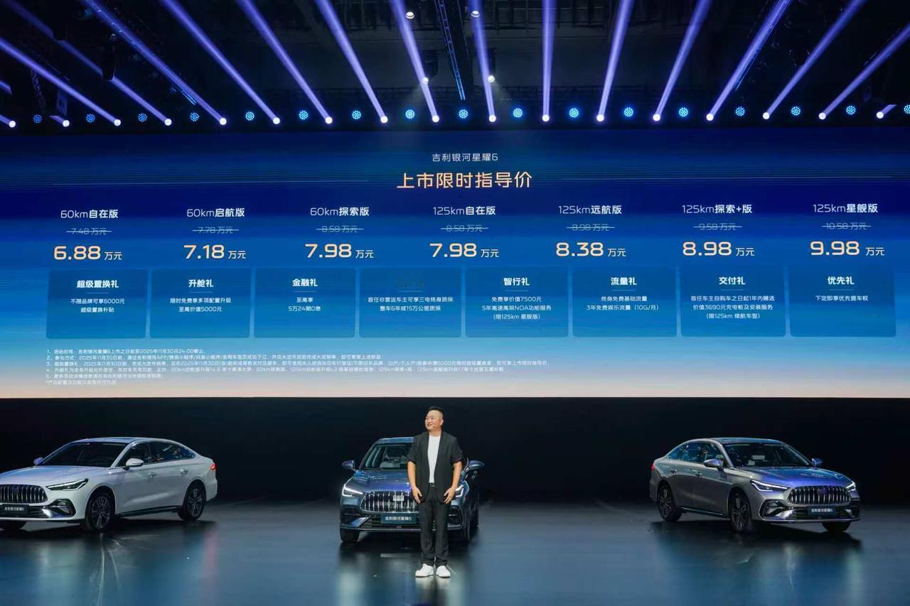 车盟快讯:10月30日,吉利银河星耀6全球上市,含60km续航(3款)、125km续航(4款)共7个版本,上市限时指导价6.88万-9.98万元,活动截止2025年11月30日。下订享七重礼:不限品牌6000元置换补贴、全系升舱(对外放电+车对车充电,部分加配14.6英寸大屏/L2辅助)、至高5万24期0息,首任非营运车主享三电终身质保。新车搭雷神AI电混2.0,CLTC馈电油耗2.8L/100km、综合续航1700km;4806mm车长+2756mm轴距打造B级空间,71.6%高强钢车身+神盾电池(8针同刺不燃)通过超国标安全挑战,还配银河FlymeAuto座舱、城市NOA,经200万公里耐久测试。兼具极致性价比和超级产品力的新一代电混家轿只要6.88万起,这个价格大家满意吗?