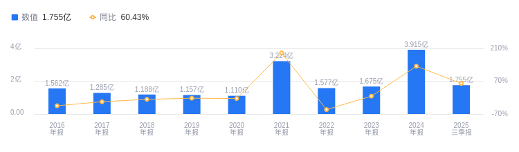 2025年三季度,*ST万方营业收入为1.76亿元,在行业64家公司中排名第51。行业第一名中航成飞营收482.86亿元,第二名中航光电营收158.38亿元,行业平均数为18.98亿元,中位数为5.75亿元。主营业务构成中,农产品加工及销售1.26亿元,占比82.34%;有色金属1792.68万元,占比11.75%;军工产品736.76万元,占比4.83%;其他165.67万元,占比1.09%。当期净利润为-1141.42万元,行业排名38/64,行业第一名中航成飞净利润21.75亿元,第二名中航光电净利润18.84亿元,行业平均数为9450.76万元,中位数为374.32万元。