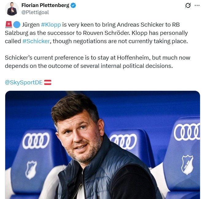 直播吧10月30日讯记者FlorianPlettenberg报道,克洛普非常渴望为萨尔茨堡红牛引进霍芬海姆总监希克尔,以接替施罗德。