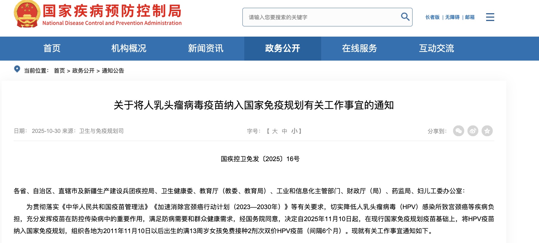 10月30日,国家疾控局、国家卫生健康委等七部门联合发布重磅消息,自2025年11月10日起,人乳头瘤病毒(HPV)疫苗将正式纳入国家免疫规划。