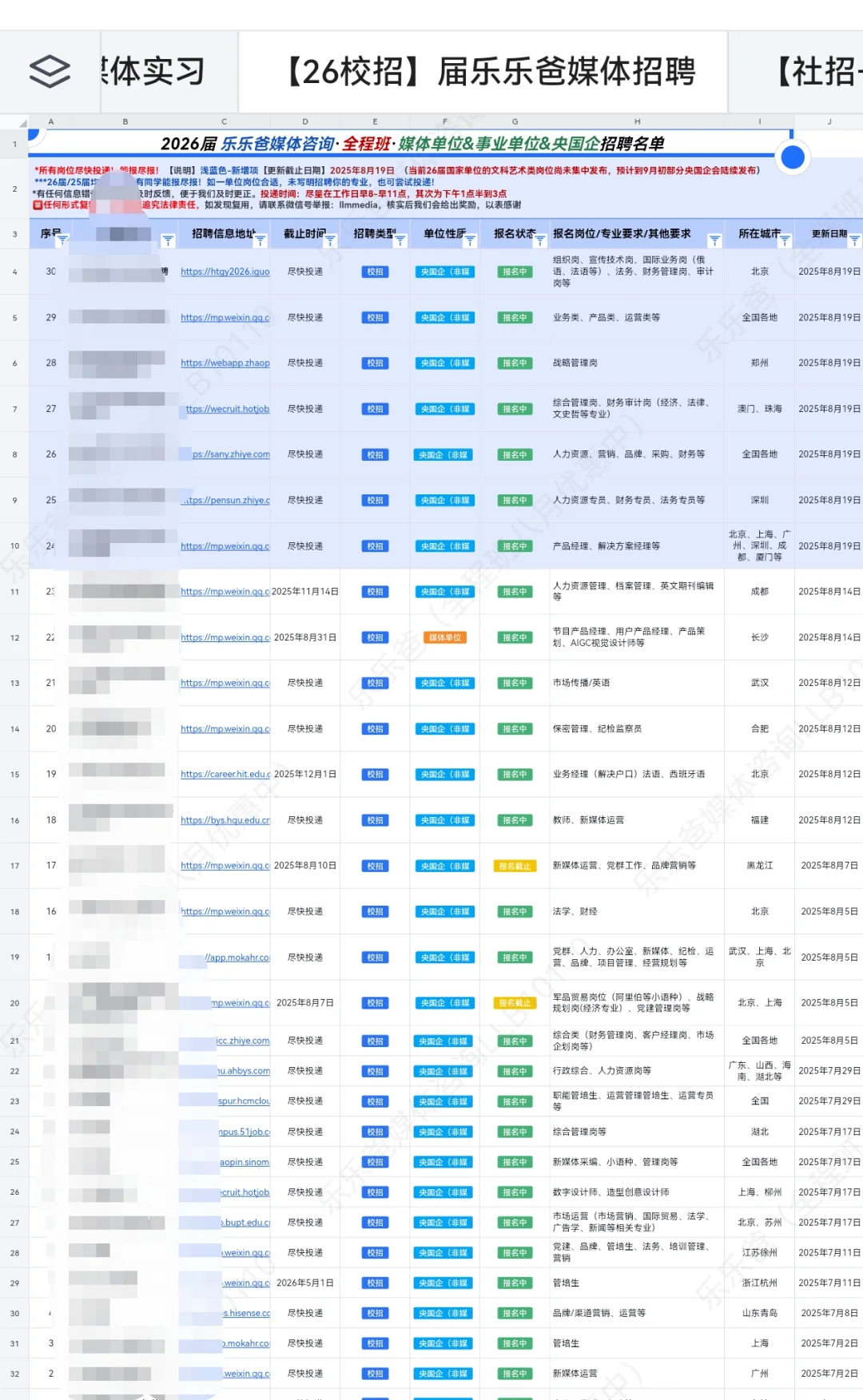 ✅秋招已经来临,乐乐爸给同学们汇总了部分秋招优质的央国企及媒体单位。 👏一些大型央国企比如三大运营商、三桶油、保险、银行等都会在秋季展开招聘 ✅同时头部央媒新华社、人民日报、总台也会在10-12月公布招聘计划。 🎈待遇毋庸置疑,行业顶端全部拉满!同学们速速准备吧!