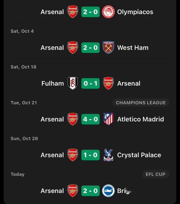 2025年10月,阿森纳成为英格兰顶级联赛历史上第一支在一个月内踢满六场比赛并全部获胜且一球未失的球队。