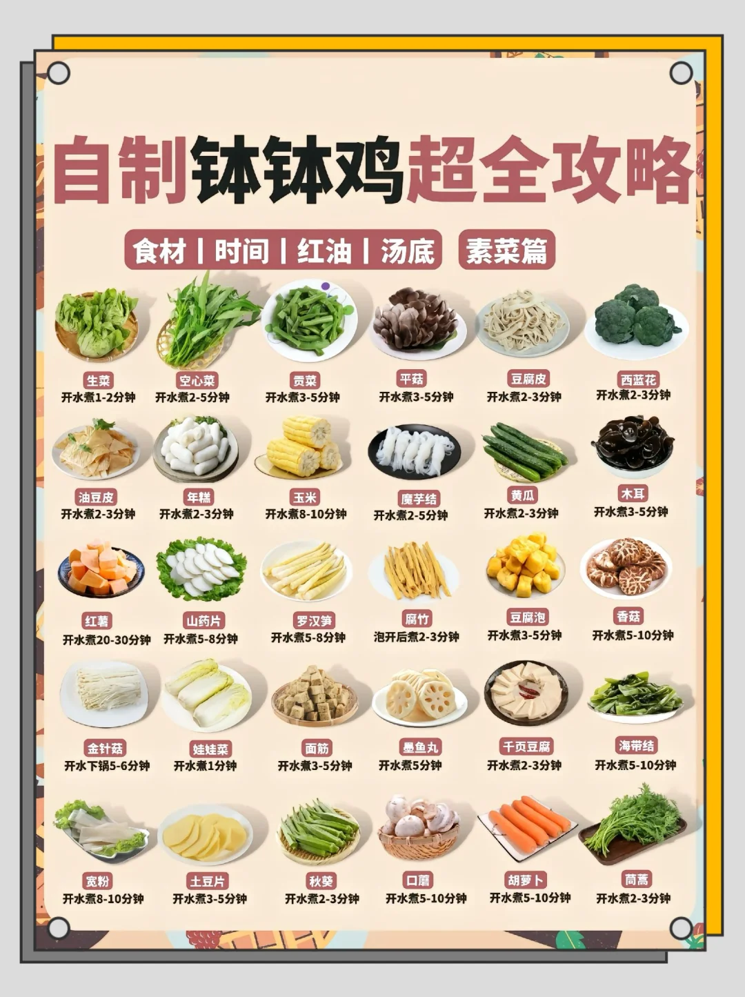 ▪️ 素菜:土豆藕片泡水去淀粉,红薯山药煮20分钟,其他蔬菜烫1-5分钟,脆嫩不软烂!🥦