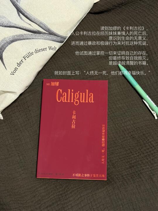 读到加缪的《卡利古拉》,主人公卡利古拉在经历妹妹兼情人的死亡后,意识到生命的无意义,进而通过暴政和极端行为来对抗这种荒诞。他试图通过掌控一切来证明自己的存在,但最终导致自我毁灭。