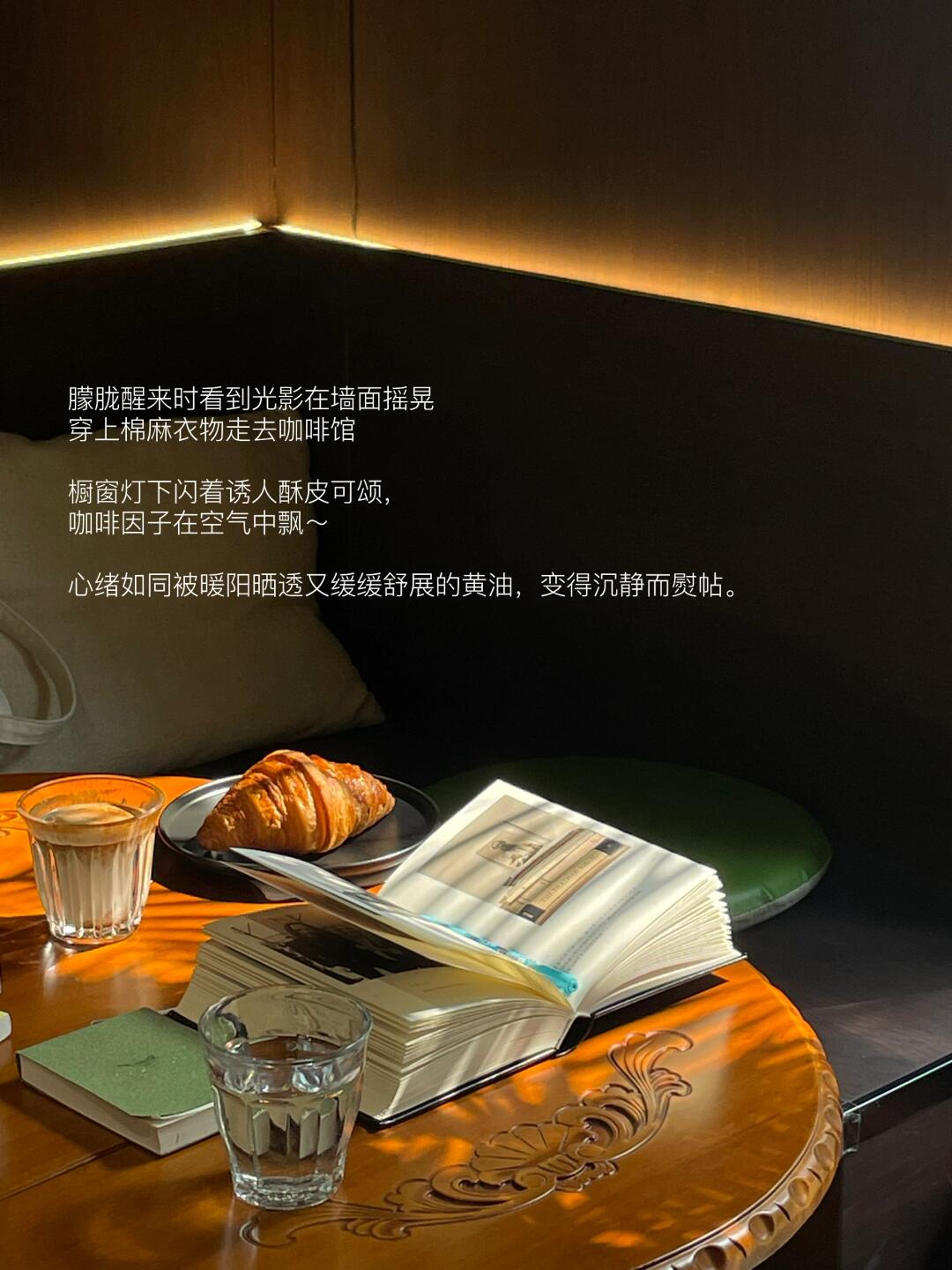 橱窗灯下闪着诱人酥皮可颂,咖啡因子在空气中飘~
