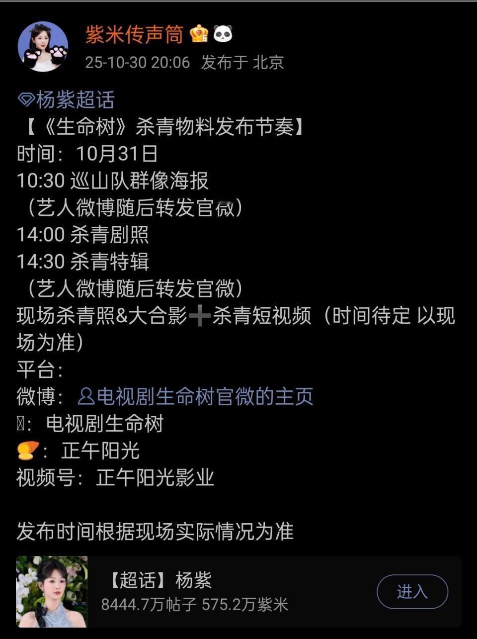 杨紫生命树杀青宣传节奏杨紫生命树明日杀青 杨紫新剧明天就要杀青啦!!!杨紫[超话