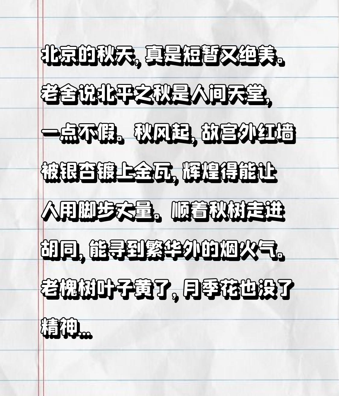 北京的秋天,真是短暂又绝美。老舍说北平之秋是人间天堂,一点不假。秋风起,故宫外红墙被银杏镀上金瓦,辉煌得能让人用脚步丈量。 顺着秋树走进胡同,能寻到繁华外的烟火气。老槐树叶子黄了,月季花也没了精神,居民们一句“您吃了吗”,满是老北京的人情味。 秋天还是垂钓的好时候,河畔、湖边,人们安静等鱼上钩,享受自然宁静。 郁达夫笔下,清晨坐院子里喝茶,看蓝天、听鸽声,这日常的诗意,最是动人。北京秋天就像果决的艺术家,一两周内完成色彩杰作,然后潇洒离去。